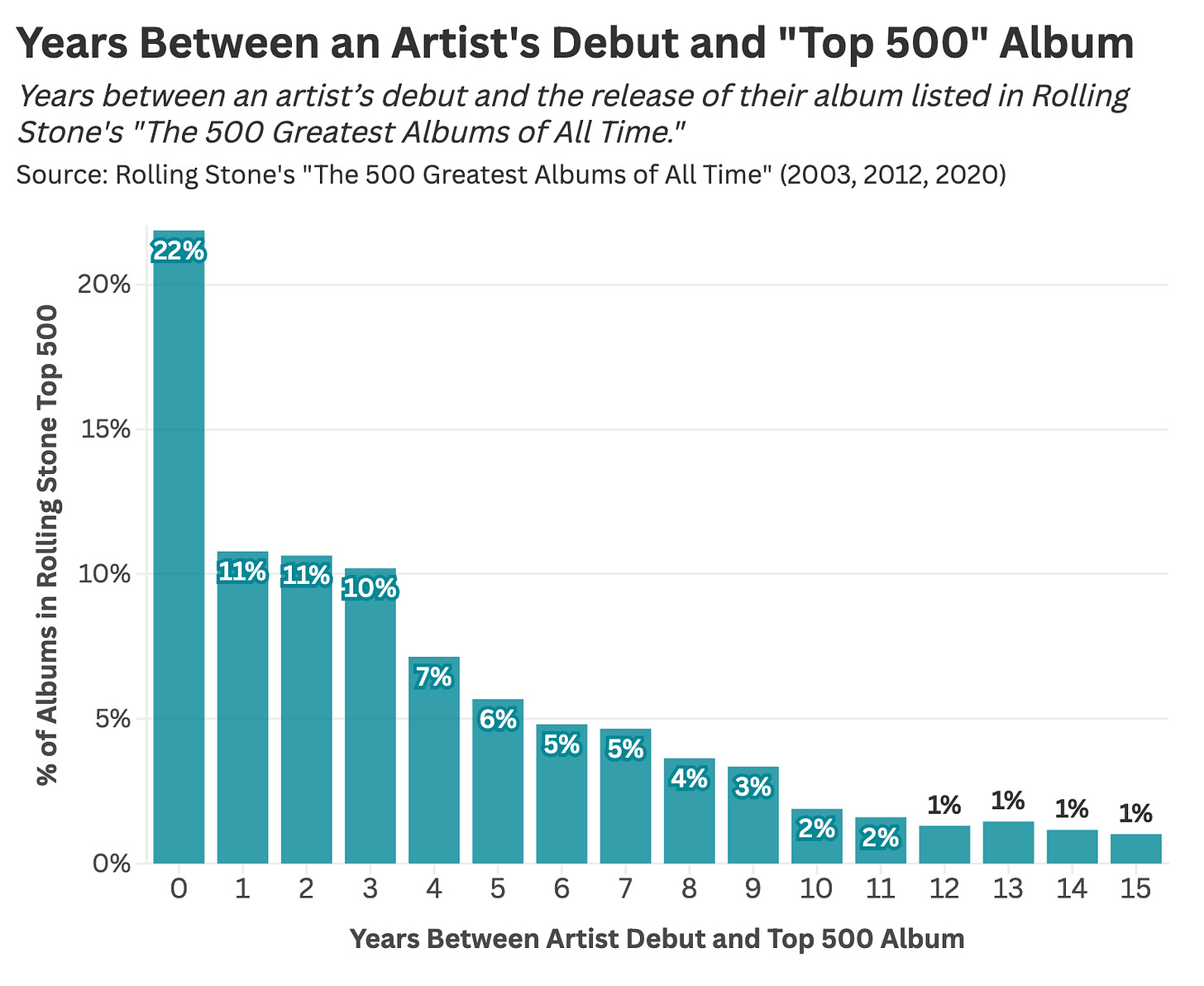 To measure the seniority of masterworks, I compiled every entry cited in Rolling Stone’s Top 500 Albums lists (spanning the 2003, 2012, and 2020 editions) and calculated the time between an artist’s debut and the release of that record.