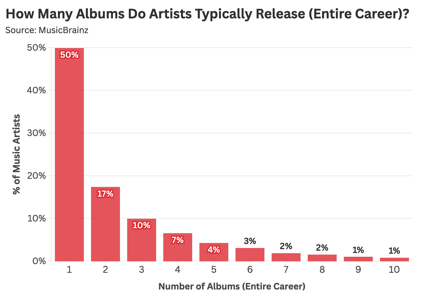 Our dataset likely understates the prevalence of one-record careers since many debut albums lack notoriety or a durable digital footprint. As such, the question we’re answering today is slightly more nuanced: amongst artists who release multiple albums, is the first usually the best?