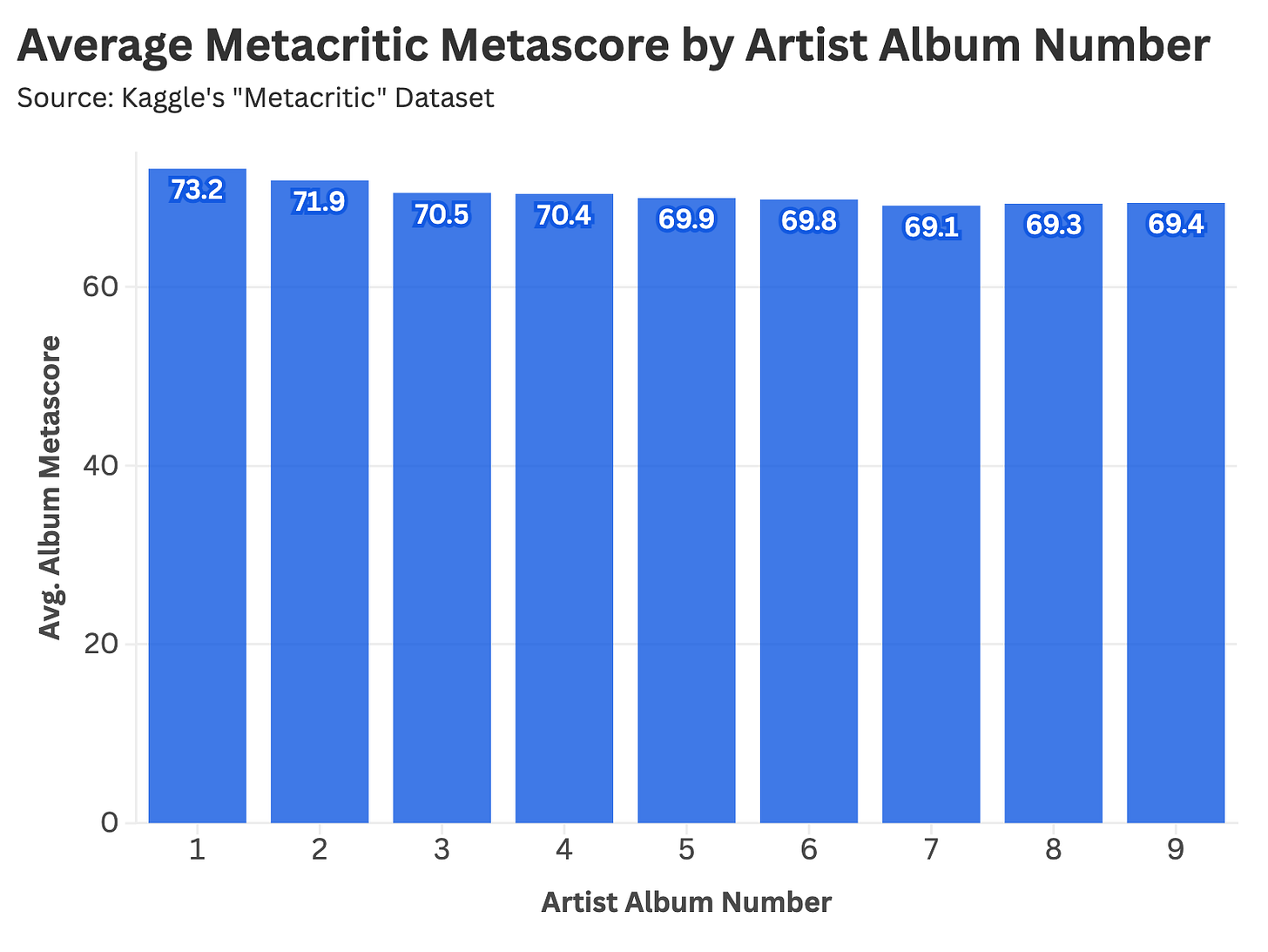 The short and simple answer to this prompt is also yes. When we look at average Metacritic Metascore by album number, we see a significant drop-off between an artist’s debut and subsequent releases.