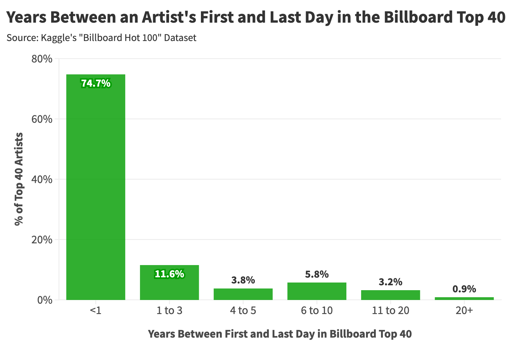 Crazier still, music acts who receive mainstream recognition usually see this acclaim dissipate just as quickly. When we examine the time between an artist’s first and last day in the Billboard Top 40, most achieve this feat for less than a year (the majority under four months).