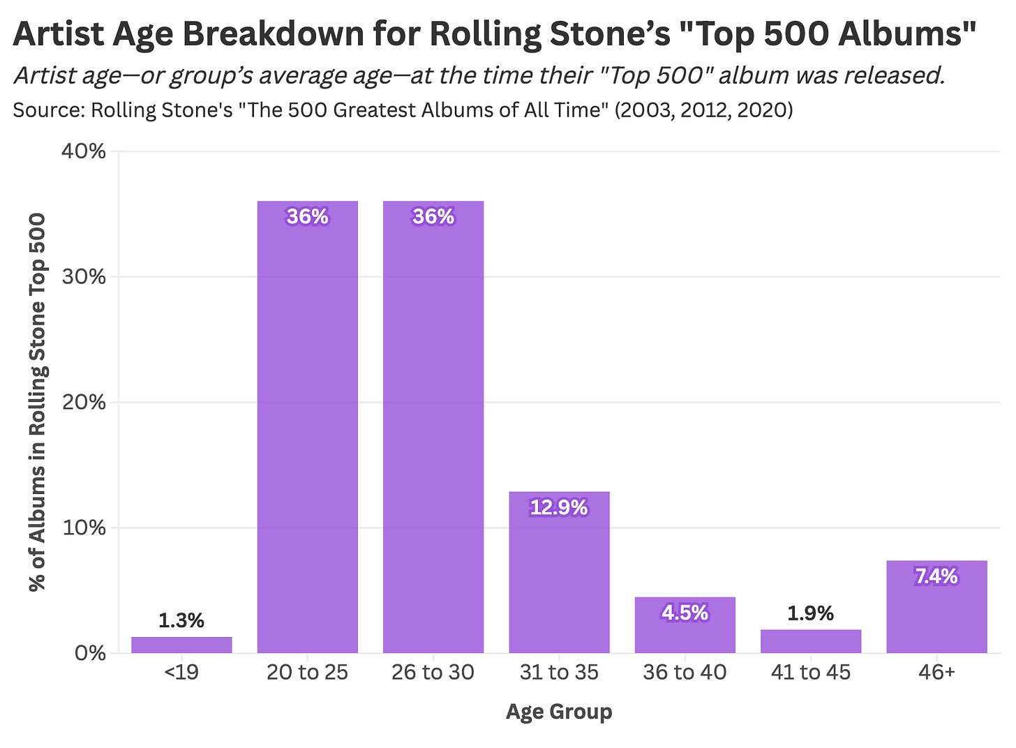 Of the combined entries on Rolling Stone’s Top 500 lists, over 70% of albums come from artists in their 20s (or groups with an average age in their 20s).