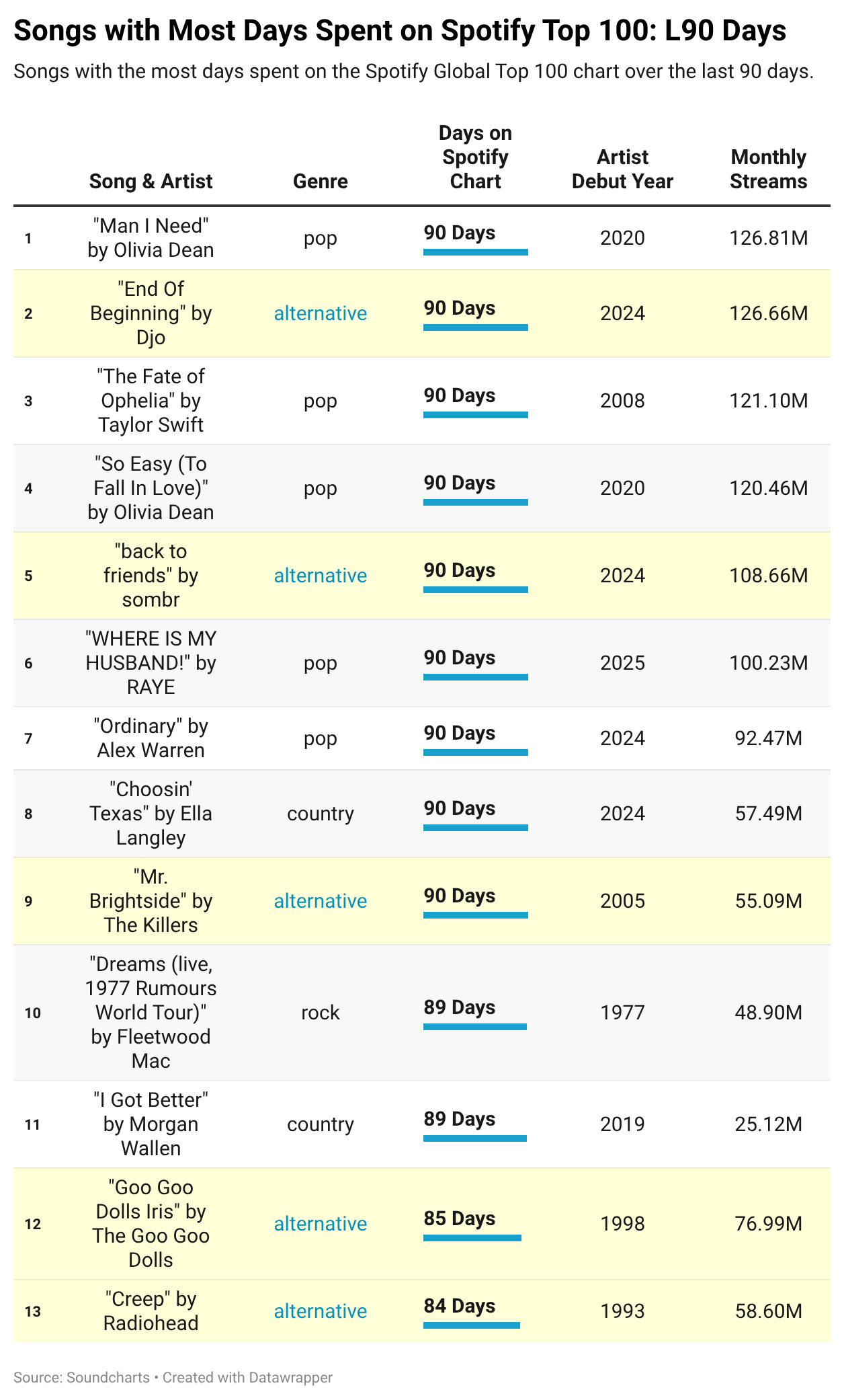 Joking aside, this deliberately vague category has carved out a real presence on both the Billboard and Spotify charts. To better understand the shape of “alternative” today, we can look at the songs dominating Spotify’s Top 100 over the last 90 days—a mix of newer artists like Djo and Sombr alongside nostalgic mainstays like The Killers and Goo Goo Dolls.