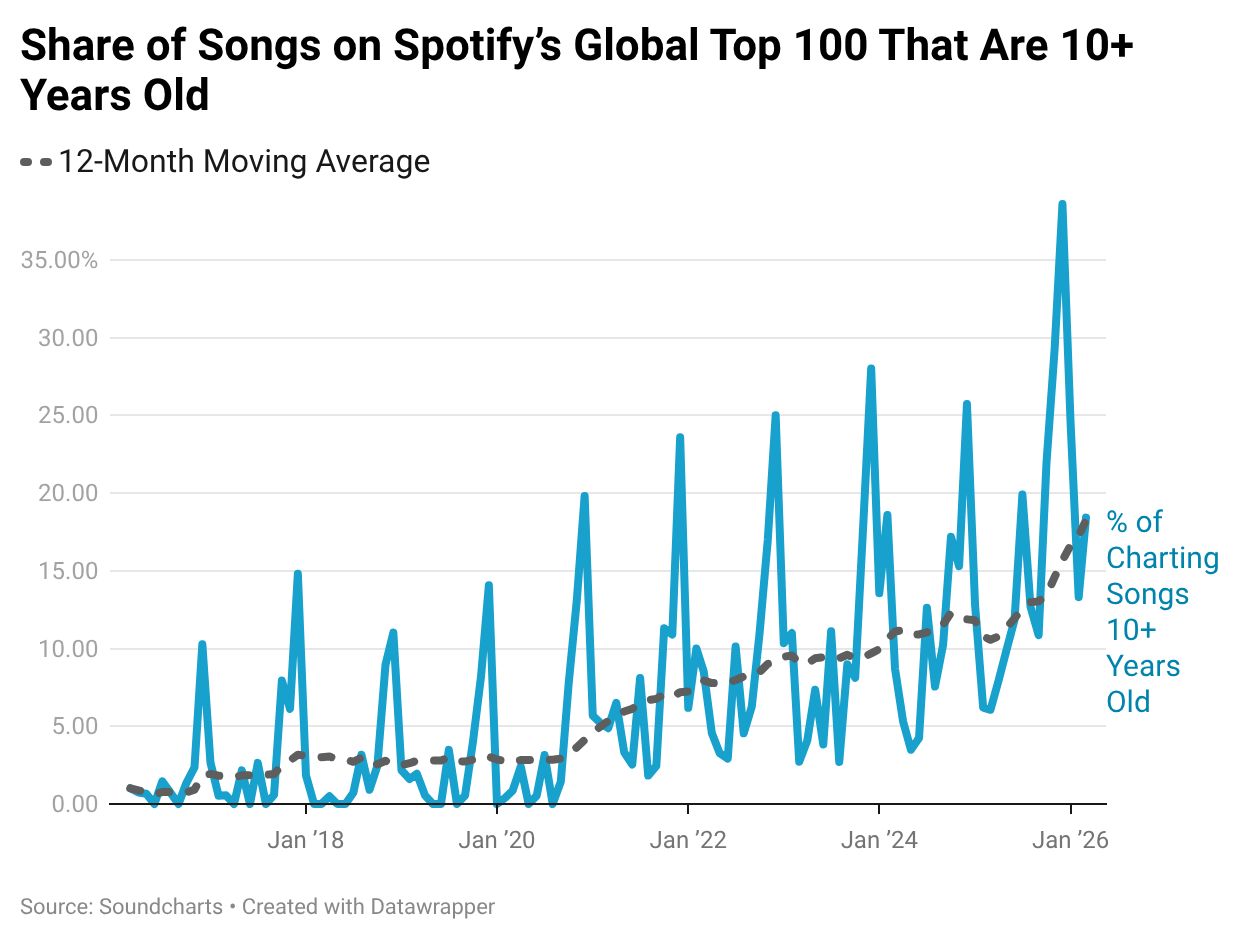 Once a year, Spotify sees an abrupt uptick in trending Christmas classics during the holiday months, followed by an ever-increasing share of older tracks from canonical acts like The Killers and Radiohead.