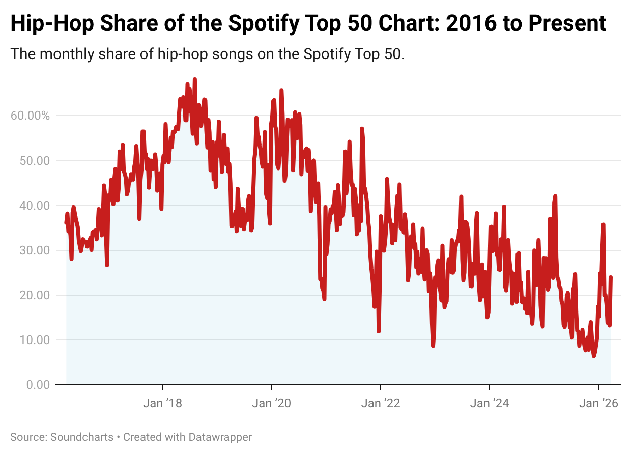 And yet, rumors of a hip-hop recession are indeed true. Over the past two years, the genre’s share of Billboard and Spotify hits has slipped, and in October of 2025, Billboard reported a week with zero hip-hop songs in the Top 40—the first such absence in more than 35 years.