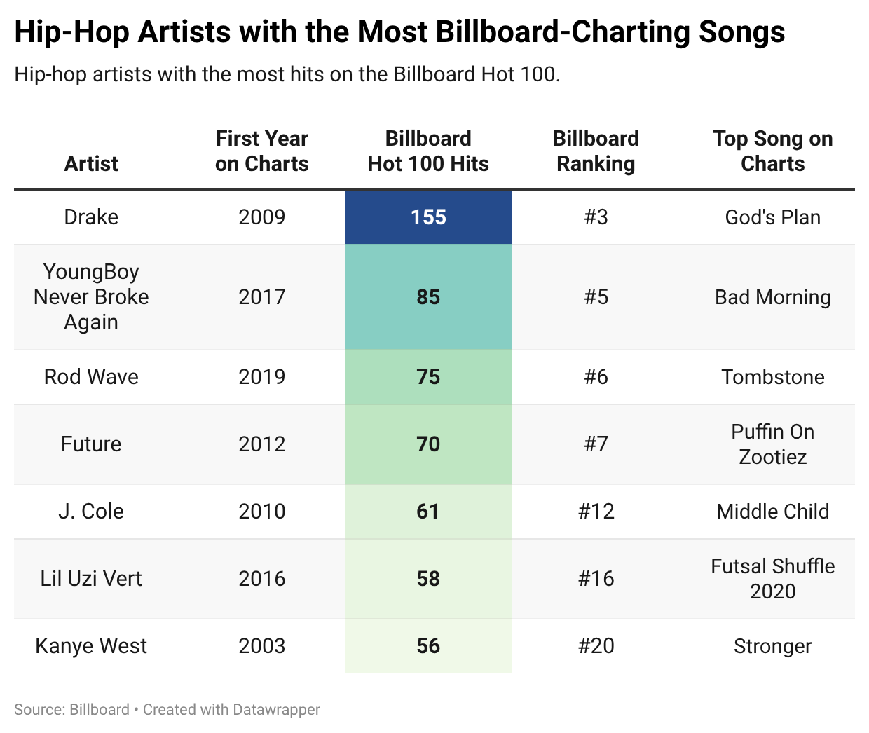Hip-hop eventually solidified itself as the defining sound of the digital age—at least thus far. Among the 20 artists with the most Billboard-charting hits (all-time), seven are hip-hop acts—a remarkable feat for a genre that first entered the mainstream in the mid-to-late 1990s.