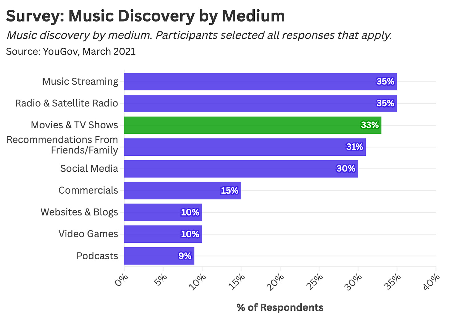 Yet movies and television still make use of pop music. A 2021 YouGov survey on song discovery found that 33% of listeners discover new tracks through television and movies.