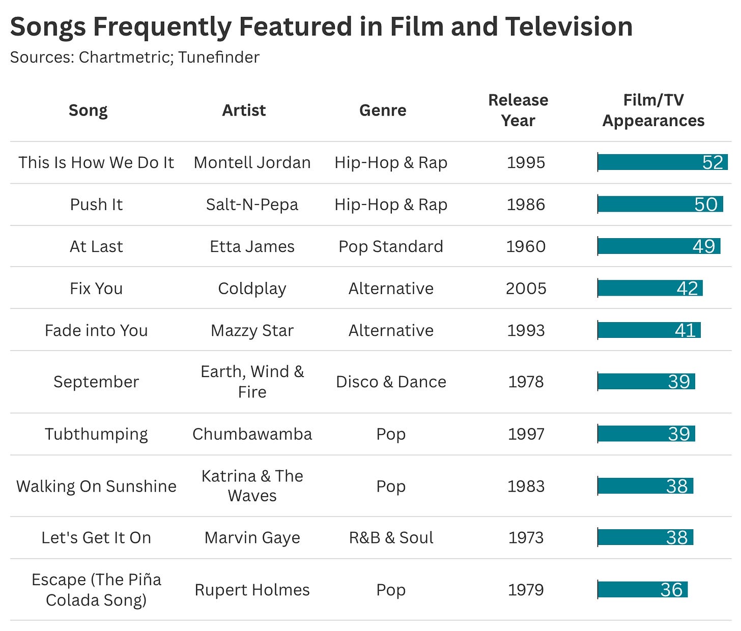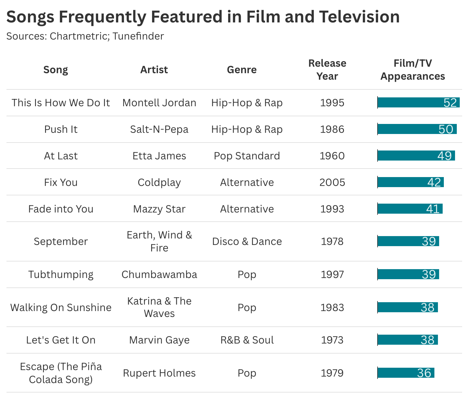 So what music are these viewers discovering? In short, they’re finding well-worn classics. Using media-citation data from Tunefinder, we see a familiar canon of iconic songs recurring throughout popular entertainment—led by Etta James’ “At Last” and Montell Jordan’s “This Is How We Do It.” Notably, the bulk of these data points come from contemporary media that’s looking backward, resurfacing tracks that are decades old.