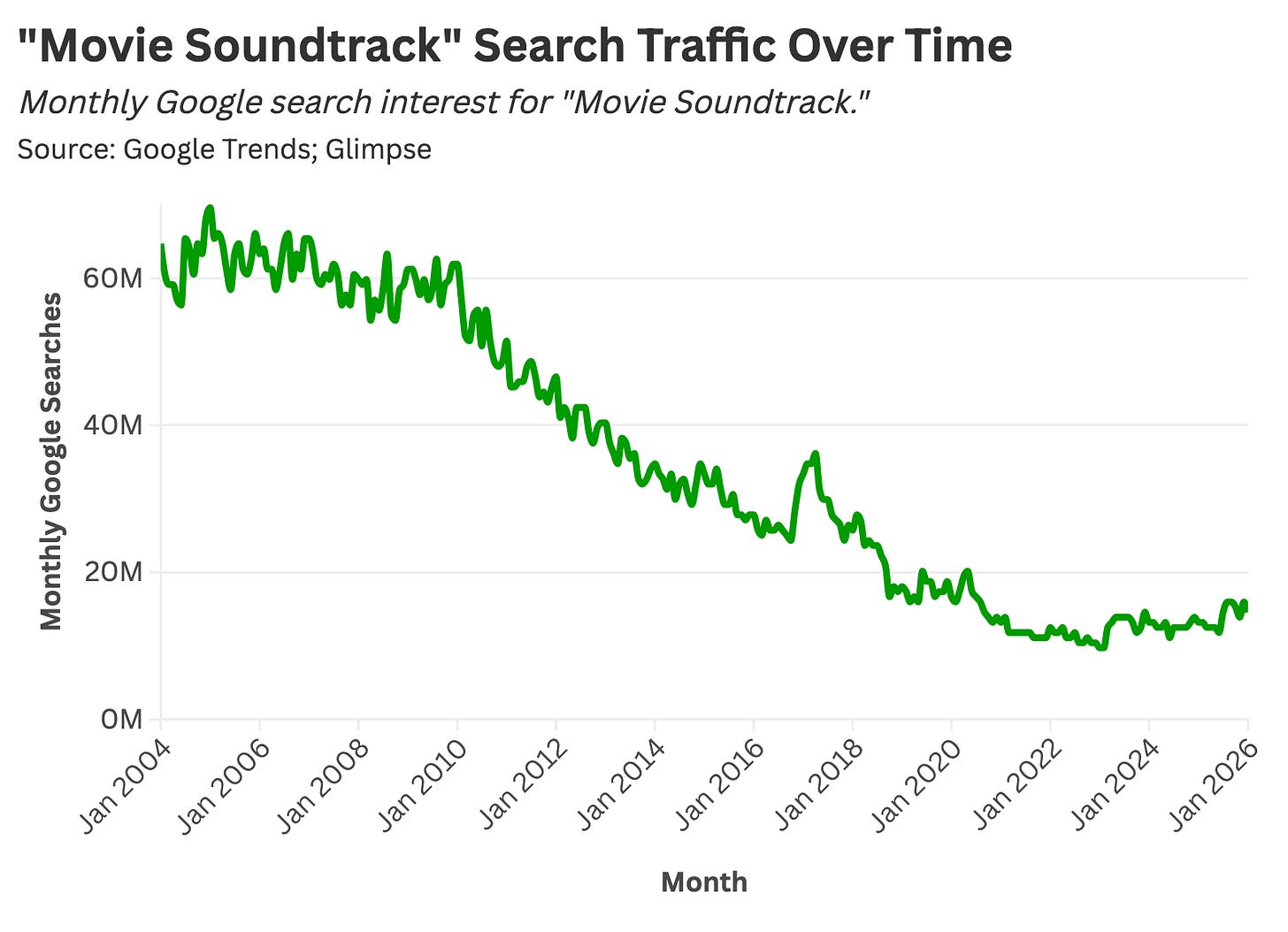 When we look at Google search volume for “movie soundtrack,” we see monthly queries begin to tank around 2008, when Steve Jobs’ iTunes ecosystem reached full maturity.