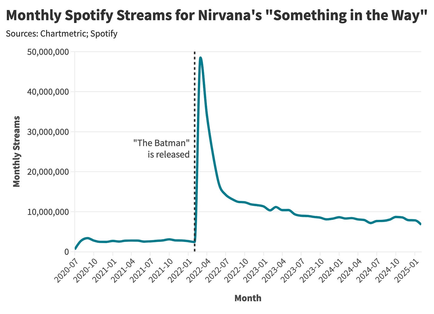 This dynamic has given rise to what I’ll call the Kate Bush Effect: the rediscovery of older staples through contemporary entertainment—à la Stranger Things’ revival of Kate Bush’s “Running Up That Hill.” We can see the same phenomenon at work with Nirvana’s “Something in the Way,” which received prominent placement in 2022’s The Batman. The film’s sizable audience triggered an immediate surge in streams, followed by an increased listenership baseline after the initial uptick.