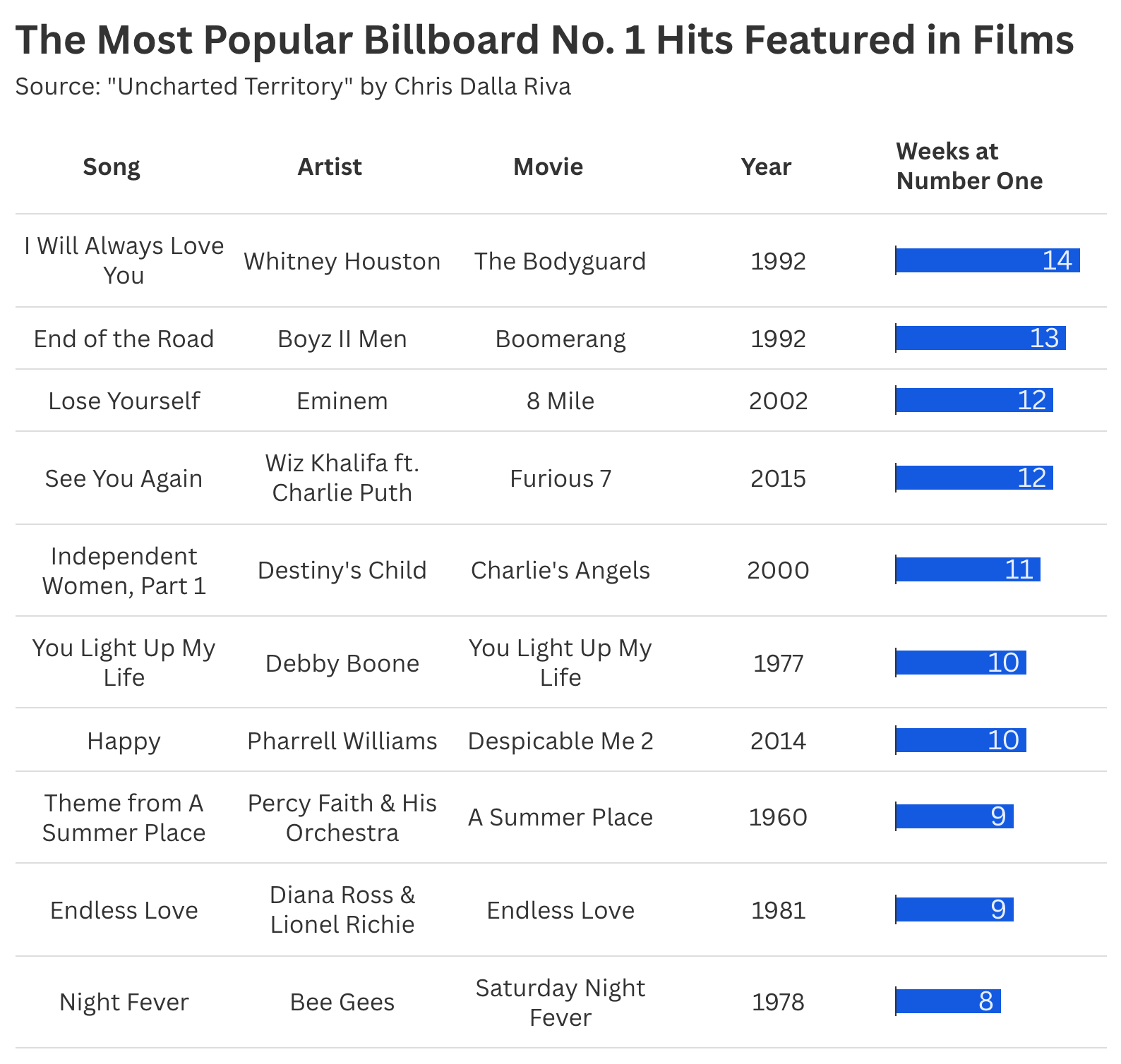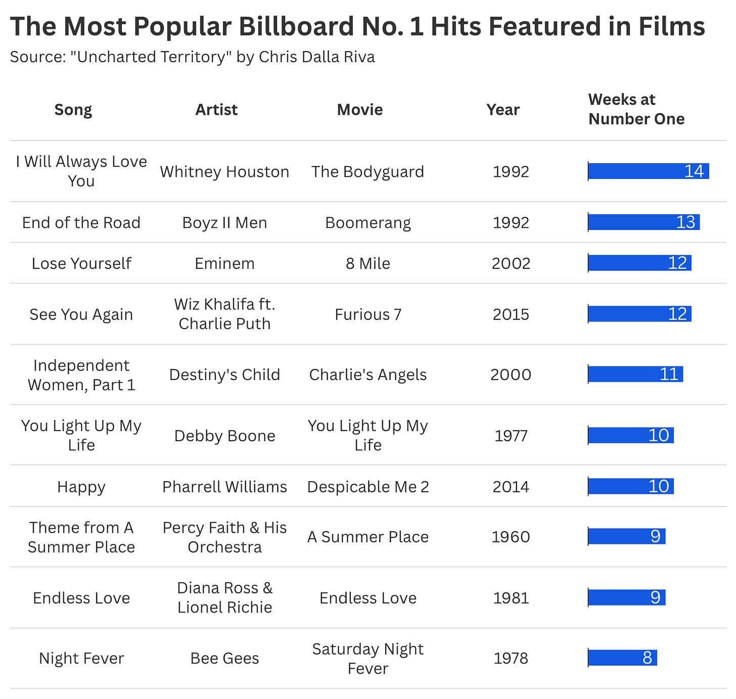 Since Billboard introduced the Hot 100, there have been 105 instances of chart-topping songs tied to contemporary films. While researching this essay, I was struck by how many pop staples were clumsily shoehorned into Hollywood projects.