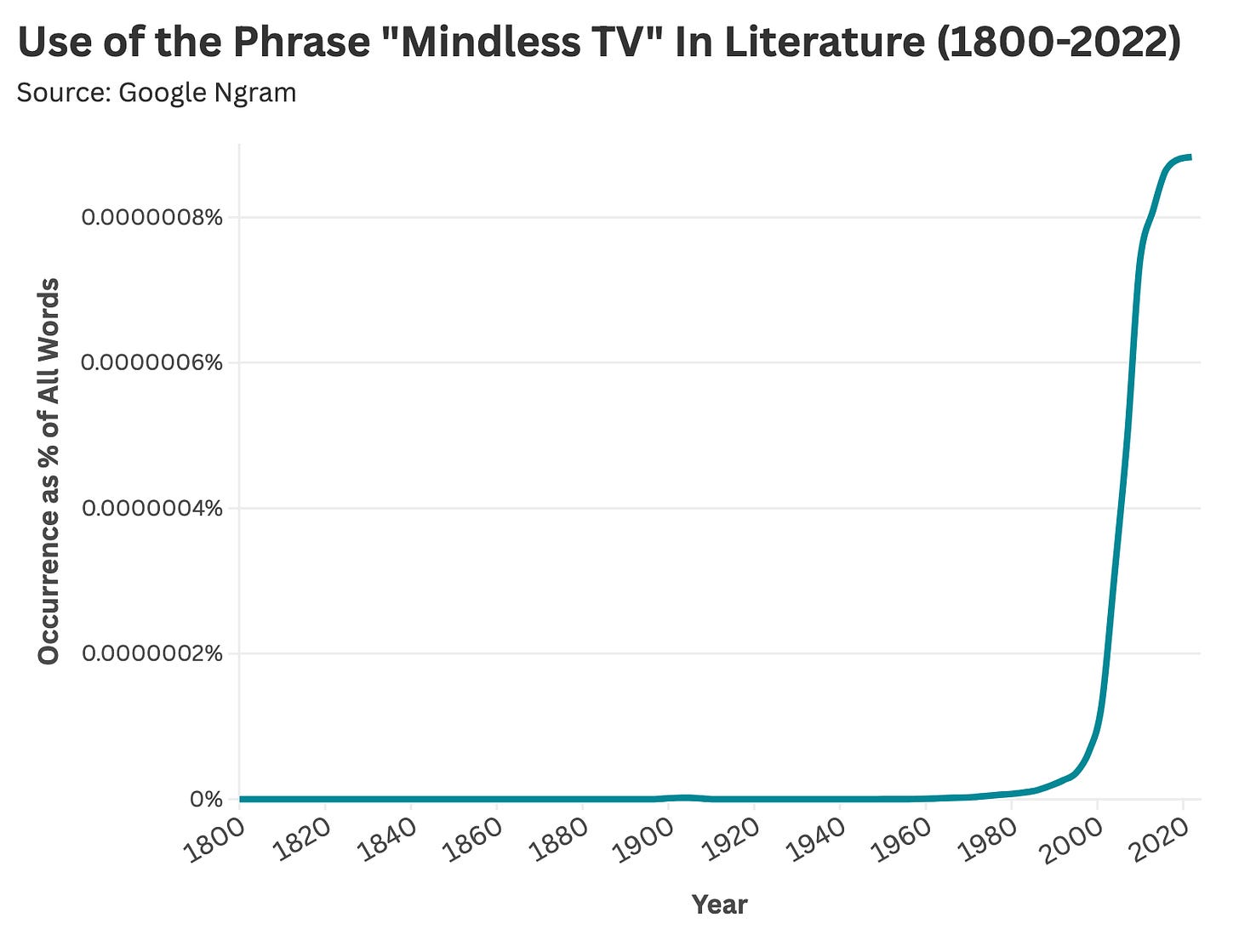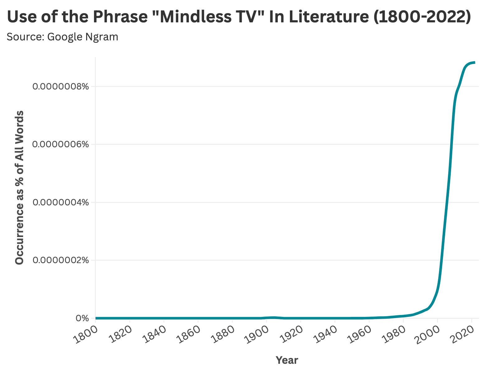 Notably, the term “mindless TV” has seen increased use in literature since the early 2000s, according to Google Ngram data. Whether the phrase is being used affectionately or critically is unknowable (though given the expression is appearing in books, I’m guessing it skews judgmental).