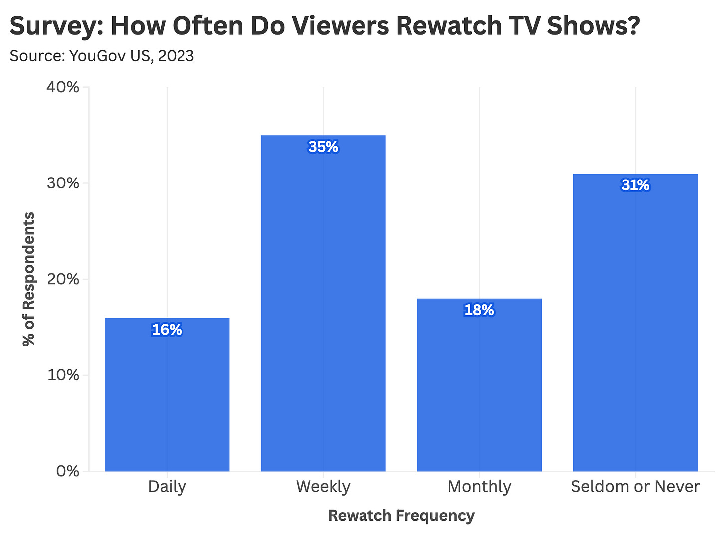 According to a 2023 YouGov survey, 69% of Americans rewatch TV episodes at least monthly, and 16% of viewers will revisit a beloved series daily.