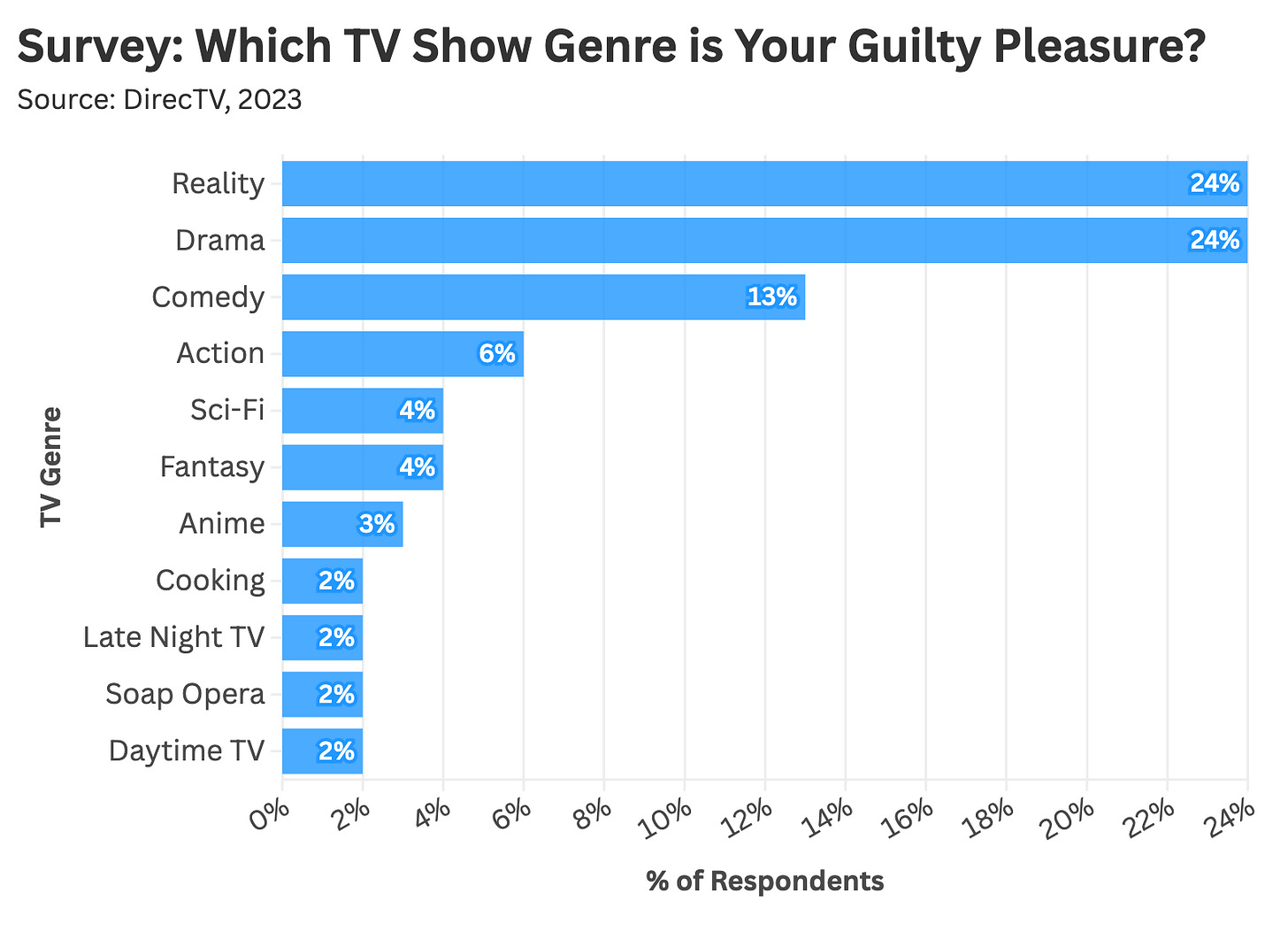 In 2023, DirecTV surveyed its customers about guilty pleasure viewing, with most citing reality TV shows (like The Real Housewives) or melodramas (like Grey’s Anatomy) as common “guilty pleasures.”