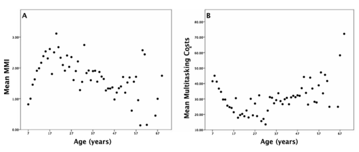 Ultimately, they found multitasking cognitive performance to be age‑dependent, with teens and twentysomethings performing better because they’ve grown accustomed to heavy digital exposure during their formative years (note: in graph B, higher scores are worse).