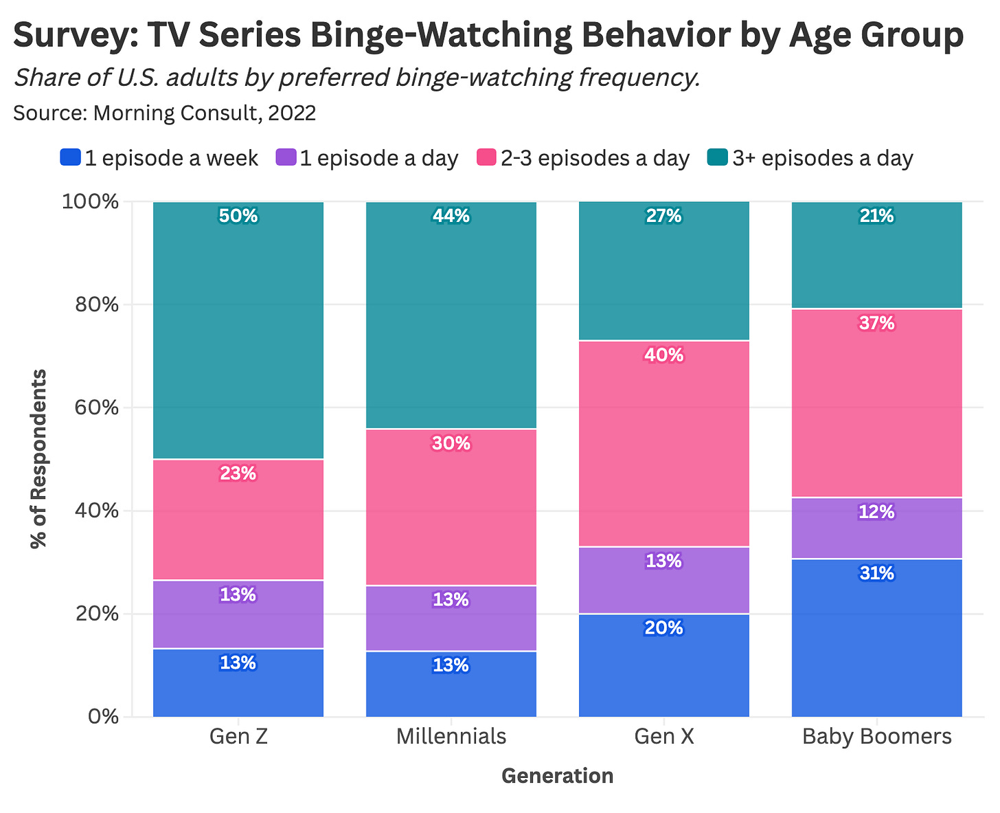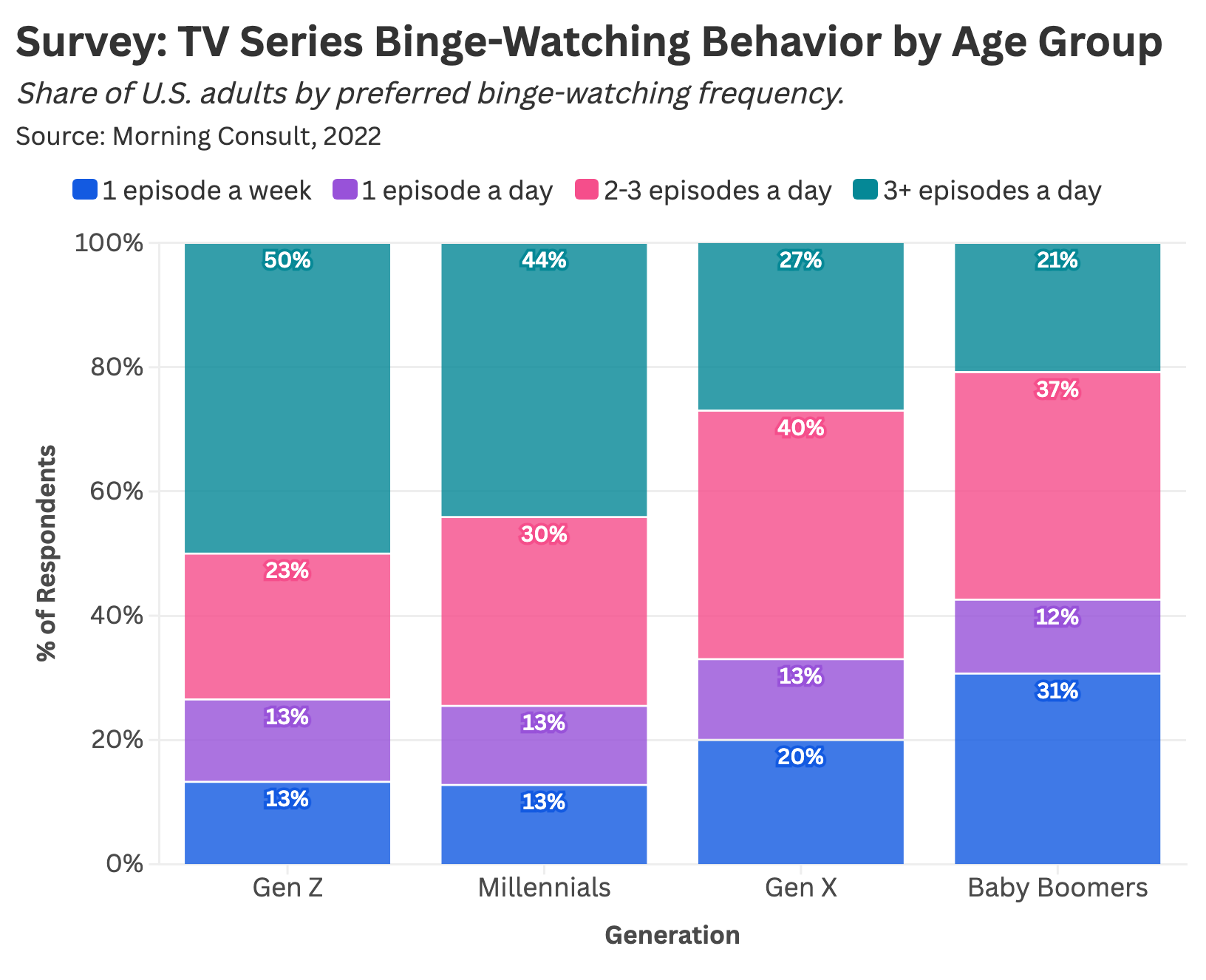 By now, almost everyone is familiar with the idea of binge-watching: a consumption pattern increasingly favored by younger generations raised on seamless content access and autoplay features. Television shows are now consumed in large chunks, with Gen Z and Millennial viewers reporting a preference for watching three or more episodes in a single sitting.