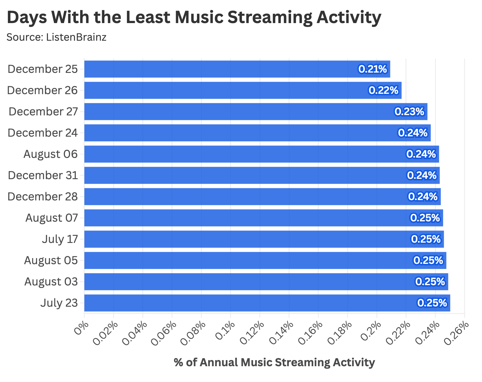 When we examine the days with the lowest streaming activity, we find a mix of major holidays and peak summer dates. People don’t listen to music during Christmas or on vacation because they’re too busy spending time with their family and going to the movies. How wholesome.