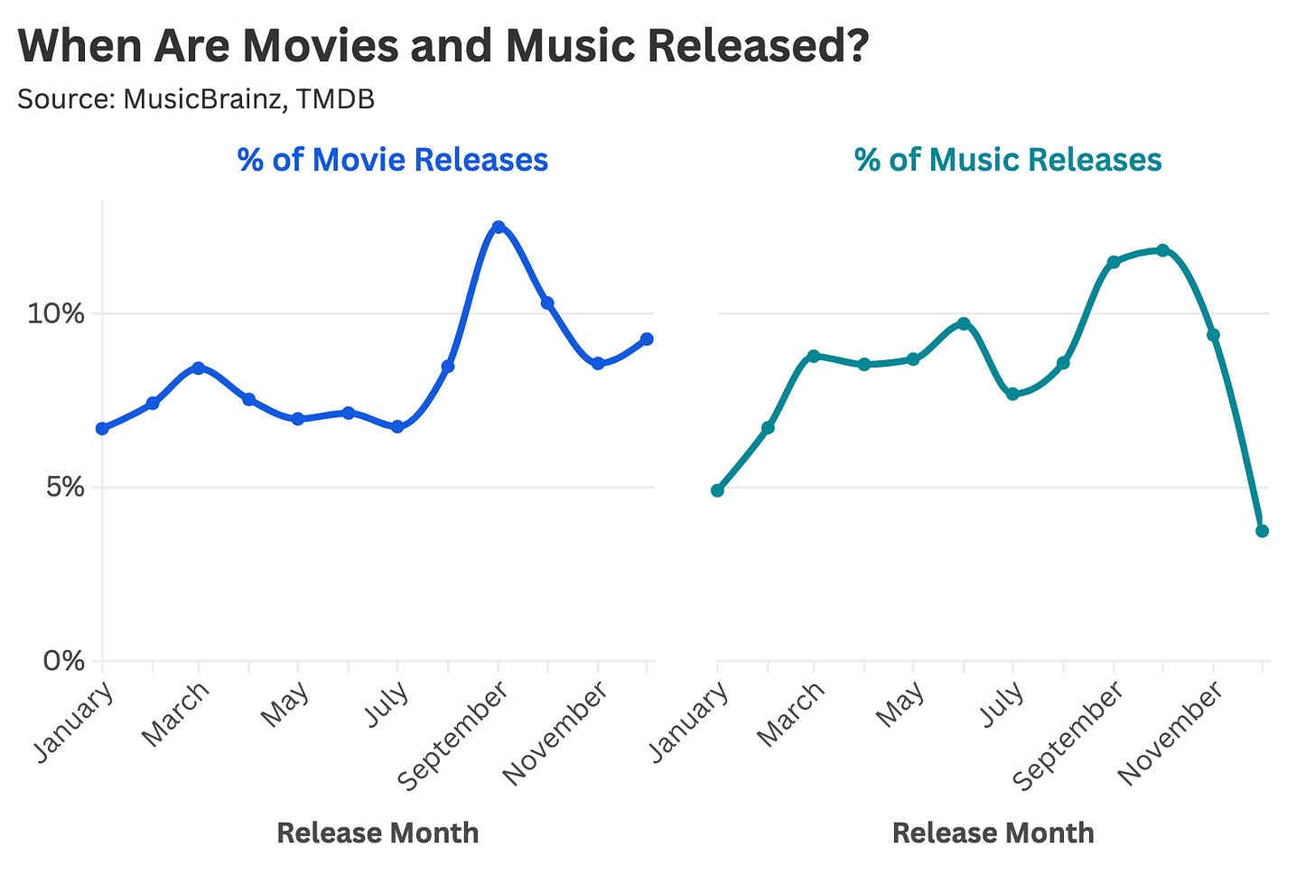 Releases tend to be weighted toward the back half of the year for both film and music. Both industries see upticks in distribution in September and October, followed by a steep drop-off in November and, for albums, in December.