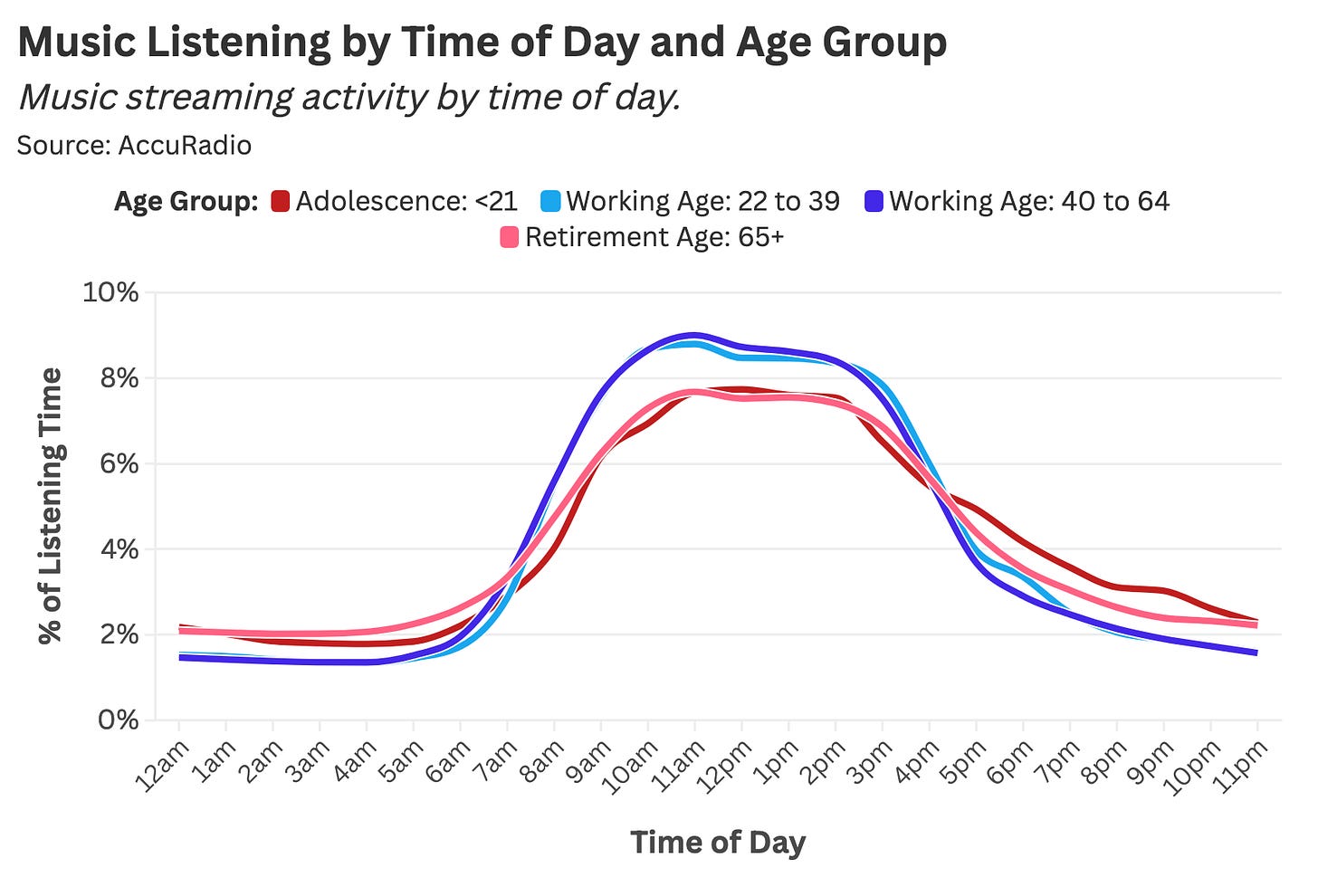 Working-age groups (highlighted in blue) exhibit a higher proportion of their music consumption during work and commuting hours, whereas adolescents and retirees are more likely to stream at night.