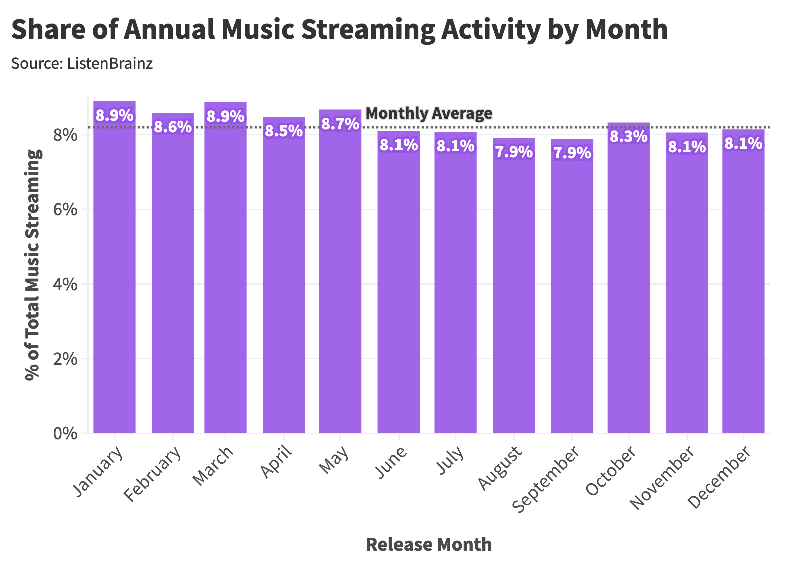 Artists are far less likely to release new music in December, when overall listening declines and year-end attention is monopolized by Christmas classics. The September–October uptick in album drops appears to be a deliberate attempt to avoid the holidays—maximizing the odds that a new record gains traction without seasonal interference.
