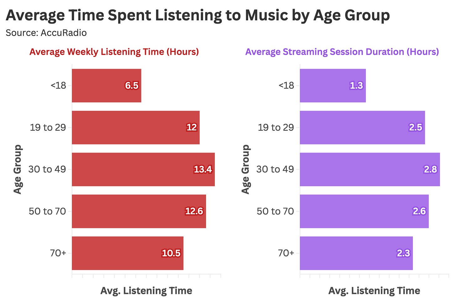 On a week-to-week basis, listeners aged 30 to 70 spend more time on streaming platforms than younger and older cohorts.