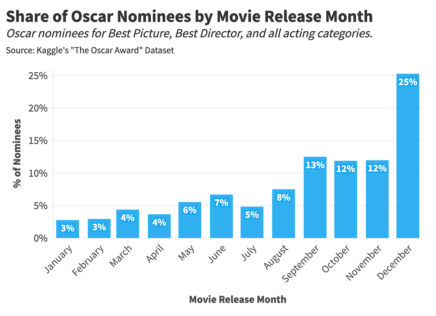 Blockbuster cultivation explains the drop in summertime releases, but what drives the uptick in October and November premieres? Why, the Oscars, of course! I have dedicated two articles to the Oscars, and, consequently, these are my two worst-performing pieces because most people do not care about the Oscars. Or do they?
