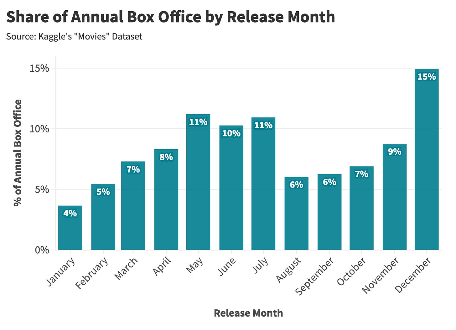 Part of the fun of writing this newsletter is perpetual discovery. Despite producing ~150 artisanal essays on the facts and figures underlying popular culture, I am still consistently wrong (which, depending on how you look at it, is either sad, comforting, character-building, or a combination of all three). With most analyses, I have a directional sense of which way the results will go. But not with this one. My initial findings were nowhere near expectations. Why would summer see fewer movie premieres if that’s when all the blockbusters debut? Why are fewer albums dropped in December if that’s when people buy the most stuff?