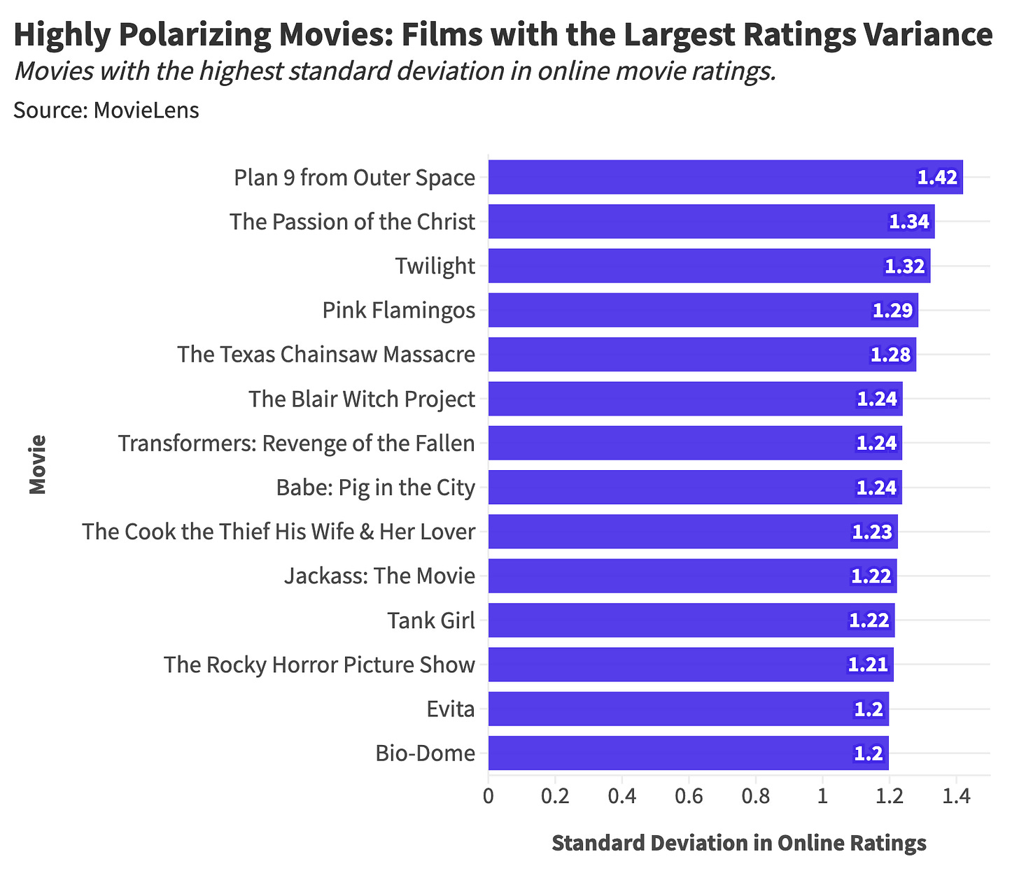When we calculate our variance metric by film, our resulting list is headlined by Plan 9 from Outer Space, followed by works spanning a wide range of genres, budgets, and subject matter.