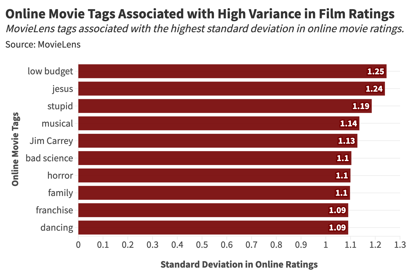 When we aggregate rating variance by MovieLens tag, systematic patterns emerge across production economy (low budget, franchise), subject matter (Jesus, bad science), and genre (musical, horror).