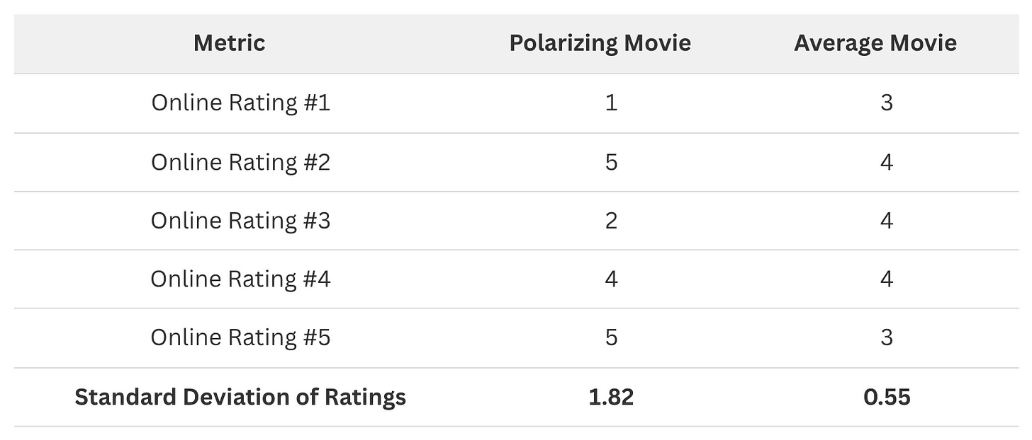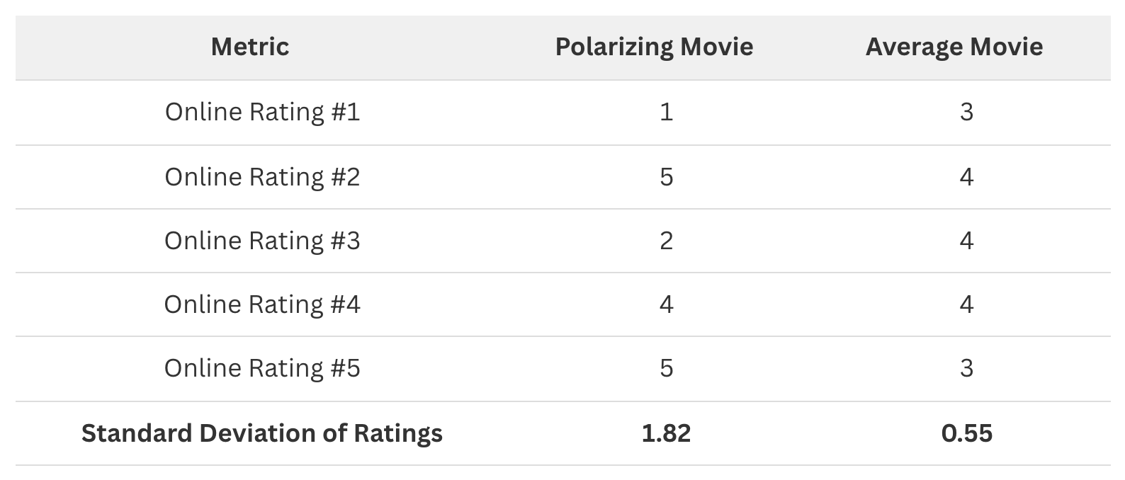We’ll use variance amongst online movie reviews as an indicator of polarization. When reviewers disagree on a film, its ratings tend to fluctuate between low and high marks (i.e., one star and five stars). Meanwhile, the “average” film usually receives scores within a much tighter range. Our analysis will use the standard deviation of online ratings to identify divisive films, calculated as follows: