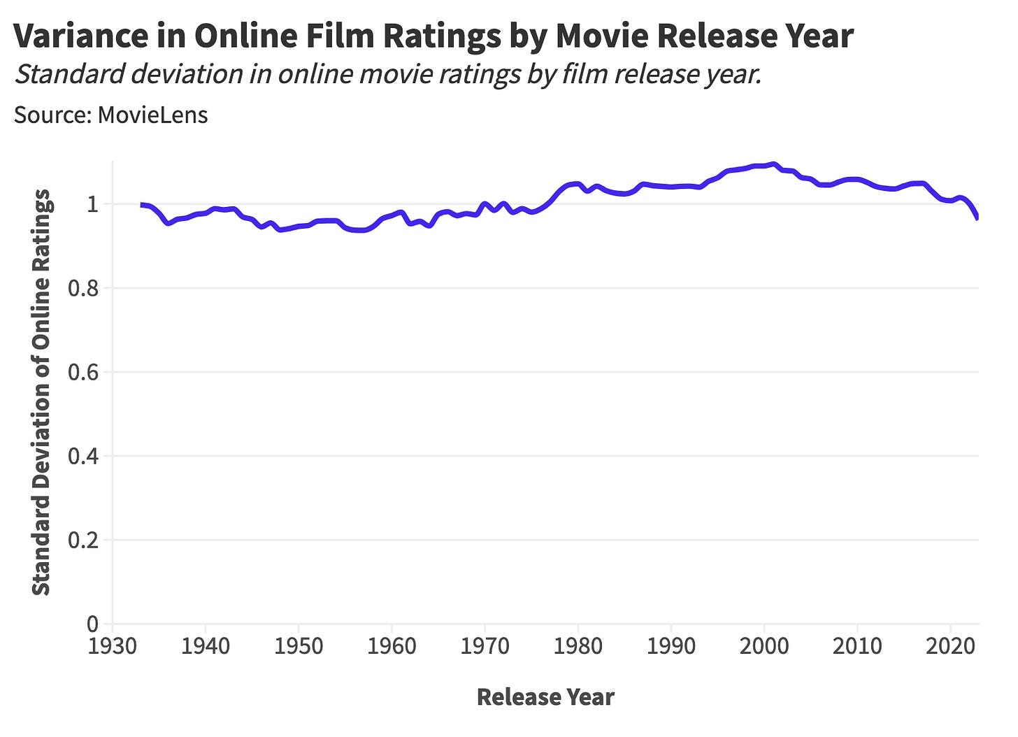 When we calculate rating variance by release year, we observe an increase in review variability starting in the late 1970s, followed by a relative decline beginning in the early 2000s.