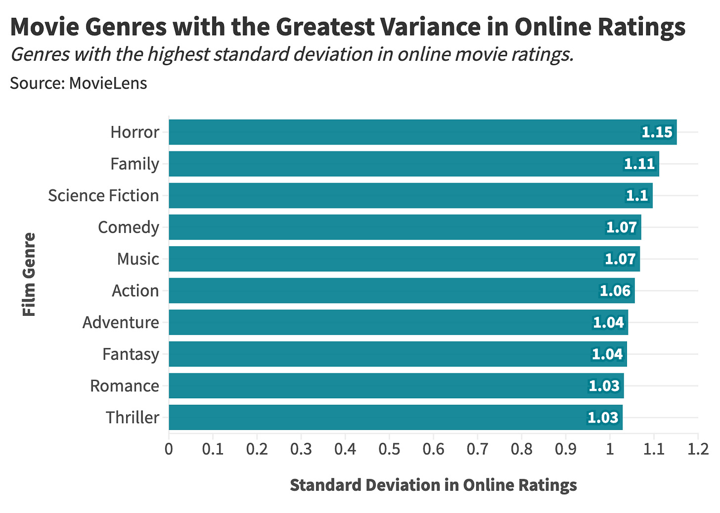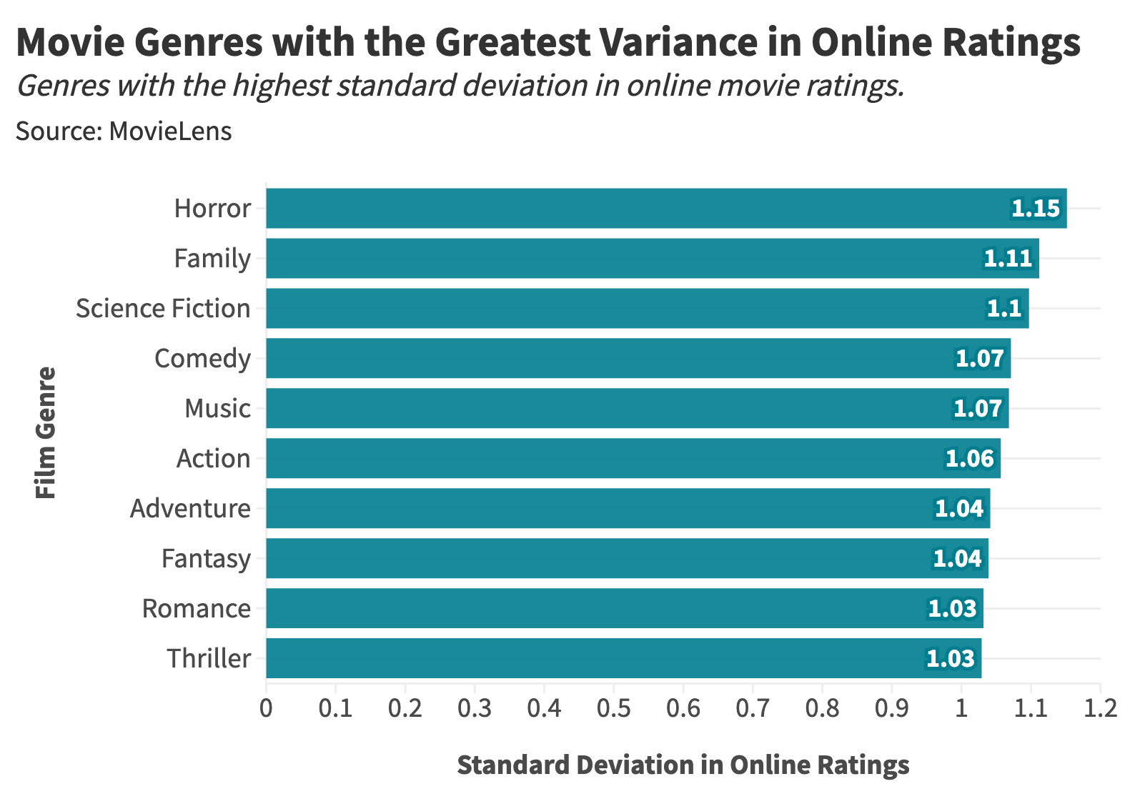 These observations emerged from a small set of highly polarizing films, prompting a natural follow-up question: do the same patterns persist across thousands of other releases? The answer is largely yes. When we aggregate rating variance by genre, horror elicits the most polarized audience response.